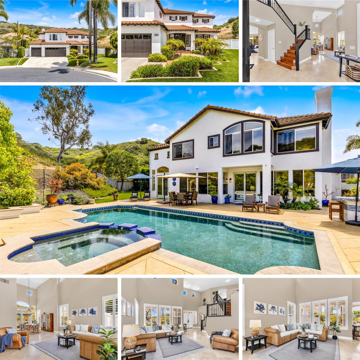 Welcome to 424 Bolivia - an exceptional home offering the largest floor plan and one of only four oversized lots of its kind in the ocean view community of Harbor View. This beautifully remodeled 5bed, 3bath home spans approximately 2,926 square feet and is set on an expansive pie-shaped lot with a prime cul-de-sac location, an opportunity seldom available. Step inside and discover a thoughtfully redesigned interior featuring polished travertine flooring throughout the main level and medium-finish walnut engineered wood floors on the stairs and upper level. The formal living and dining rooms boast soaring two-story ceilings and are lined with walls of windows, flooding the home with natural light and enhancing its sense of volume and openness. A stunning, fully remodeled kitchen is the highlight of the main level with custom white shaker cabinetry, an enlarged center island with pendant lighting and breakfast bar, double ovens, stainless steel appliances, and a completely customized pantry with dedicated broom and vacuum storage. A custom stone fireplace with wood mantle adds warmth and character to the family room and the upgraded Pella sliders at both the family room and dining room create seamless indoor/outdoor living. The main level bedroom, currently used as an office, features built-in desk and storage plus a walk-in closet. The main level bathroom has been luxuriously updated with a slab granite countertop, new white cabinetry, travertine walk-in shower, and frameless glass enclosure. Upstairs, the primary suite stuns with vaulted ceilings and windows framing scenic hillside views. The spa-like en suite includes an oversized dual-sink vanity with slab granite counters, custom travertine surround at the soaking tub and walk-in shower, and expansive walk-in closet. Servicing the upper level bedrooms, the hall bathroom features a savvy split design with separate toilet/tub area and has been remodeled with slab stone counters, dual sinks, white finish cabinetry, and custom travertine surround at the tub/shower. The builder's 5th bedroom is currently configured as a loft and can easily become a bedroom, adding versatility to the living space. A custom rod iron stair system finished with contemporary black wood adds a sophisticated architectural touch to the home. And then there’s the backyard—a true highlight of the home. Enjoy your own private paradise featuring a dark-bottom pool and spa that retains heat beautifully in the summer, a built-in BBQ/bar area, stained concrete patio, and a large turfed lawn for play and relaxation. The front yard is equally stunning with turf and custom hardscaping, and the entire exterior was recently repainted in a chic contemporary white with bold dark accents. Additional upgrades to your new home include Rohl plumbing fixtures in all bathrooms, recirculating hot water system, reverse osmosis filtration system at the kitchen, whole house carbon water filtration, new water heater, and epoxy-finish 3 car garage. As part of the master-planned community of Rancho San Clemente, residents enjoy close proximity to Lobo Elementary School, Rancho San Clemente Park, and the exclusive Life Time Fitness club. Minutes from top-rated schools, shops, restaurants, and San Clemente’s world-class surf and beaches, and only 10 minutes from the vibrant charm of downtown San Clemente ... this is not just a home—it’s a rare offering of space, style, and coastal living at its finest.